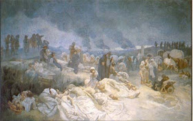 Slovanská epopej (Epopeya Eslava) nos narra a través de 20 lienzos la historia del pueblo eslavo a partir de sus principales acontecimientos, esta obra sería donada por Mucha a la ciudad de Praga en 1928, una nación nacida el 28 de Octubre de 1928, debido al del desmembramiento del Imperio Autrohúngaro, tras la Primera Guerra Mundial.
