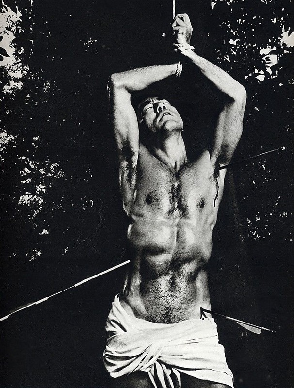 En la otra carta, Mishima adjuntó unas fotos en blanco y negro, obra Kishin Shinoyama, posando desnudo como San Sebastián, con las muñecas atadas por encima de su cabeza y sangrado con flechas perforando su cuerpo.