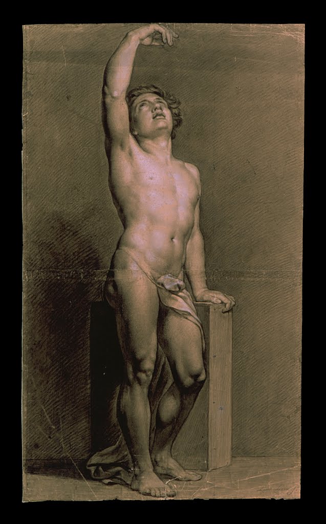 Luis López F. Desnudo masculino de frente apoyando la mano derecha en un pedestal mientras eleva el rostro y el brazo izquierdo. Colección de Bellas Artes, Universidad Complutense de Madrid.