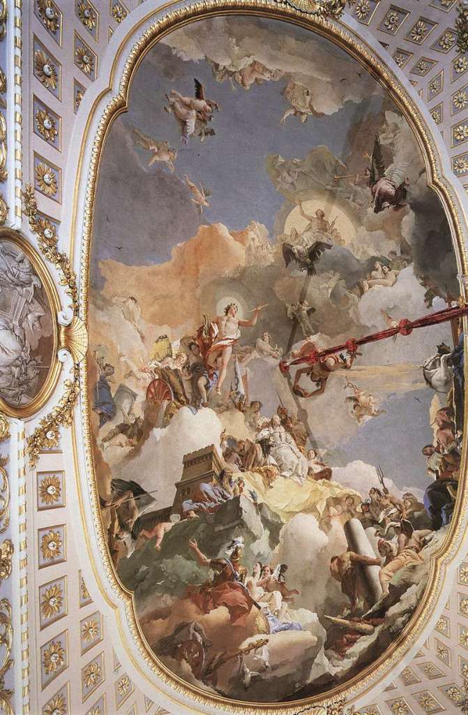 En 1761 Carlos III invitó a Tiépolo a trasladarse a España para que tomara parte en la decoración del Palacio Real de Madrid, llegando al año siguiente acompañado de sus hijos y ayudantes. En la capital española se produjo un importante enfrentamiento artístico con el Neoclasicismo de Antón Rafael Mengs, dividiéndose los críticos y artistas en dos claras e irreconciliables tendencias. Los techos del Palacio Real le llevaron varios años, logrando una de las obras más espectaculares que se han visto en cuanto a frescos por su poderoso efecto de grandiosidad y su impresionante efecto óptico.