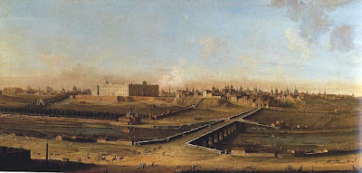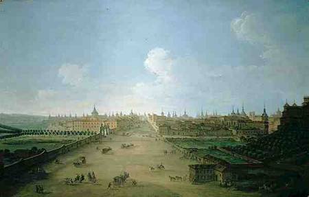Antonio Joli (1700-1777), pintor procedente de Módena, llegará a Madrid en 1750 a petición de Farinelli, para que realizara las tramoyas de las representaciones musicales que se realizaban principalmente en los coliseos del Buen Retiro y Aranjuez. Su trabajo nos da una excelente vista del aspecto, hoy irreconocible, que tenían ciertos espacios.