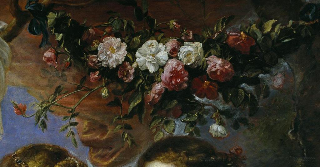 "Guirnalda de Rosas", la rosa es la flor de Venus y por tanto del amor, entre las guirnaldas se puede observar una avispa, ejemplo de pericia del autor.