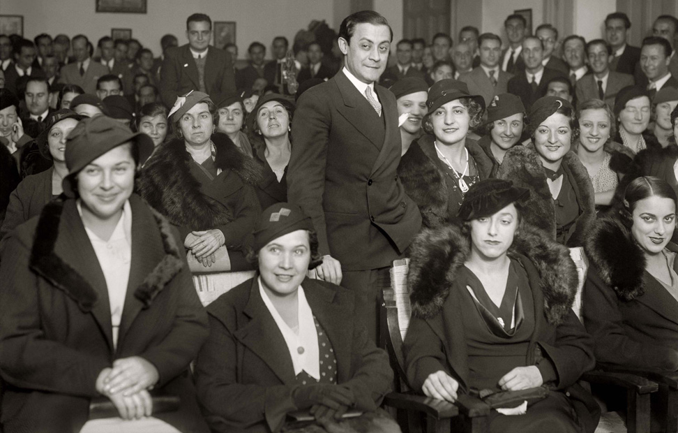El dramaturgo Enrique Jardiel Poncela durante una charla para mujeres en el Liceo Francés el 1 de diciembre de 1933.